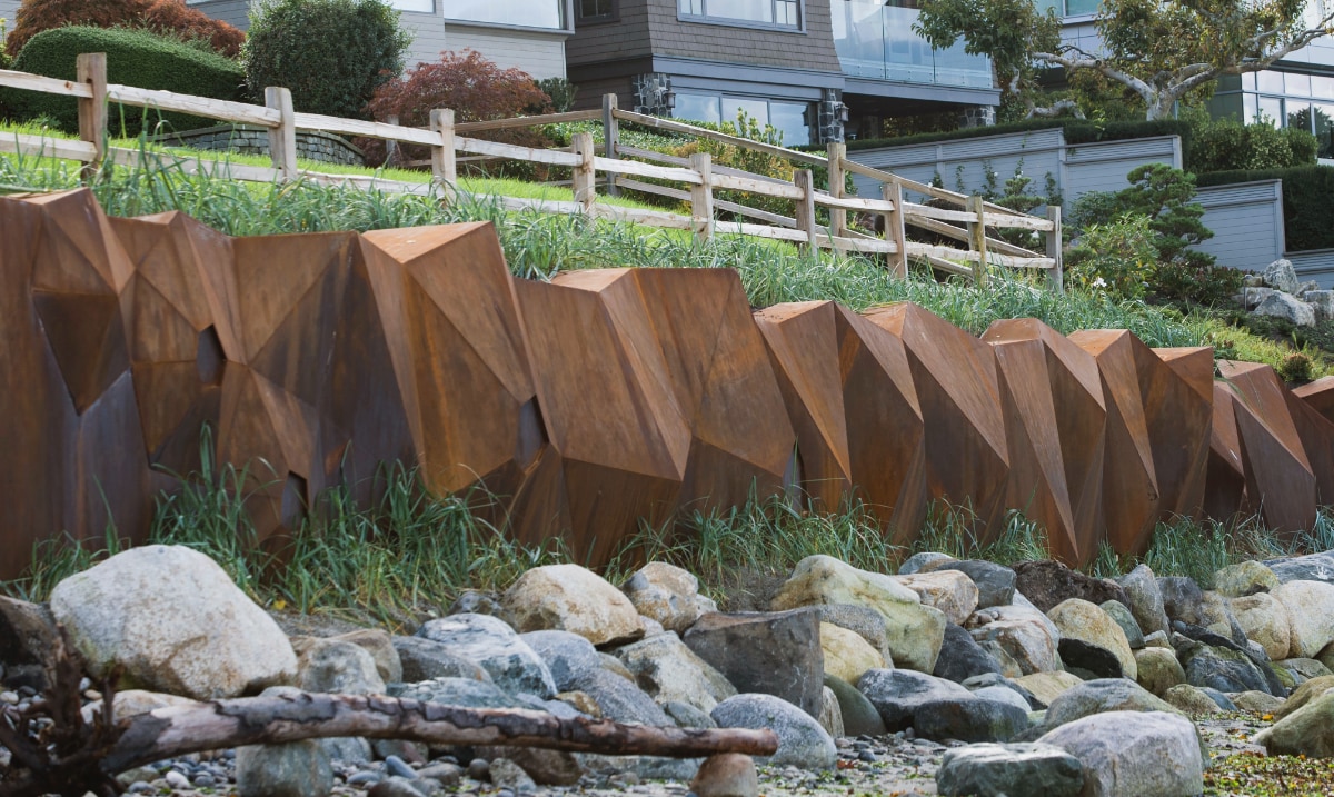 Composed of waterjet -cut Corten steel panels, the 200-foot-long multi-faceted sculpture was constructed offsite in 20-foot segments  before installation. It develops a rust-like patina made of unique alloys that provide superior protection from corrosion and weathering while dissipating constant wave movement. Paul Sangha and the team took design inspiration from rock formations that dot the shores of islands and coastlines in B.C. One might also interpret the assemblage to ancient driftwood, a mountain range at sunset or stylized rusty barge and ship parts. It’s abstract aesthetic belies its practicality of reduced maintenance as well as an emotional connection to the ocean.