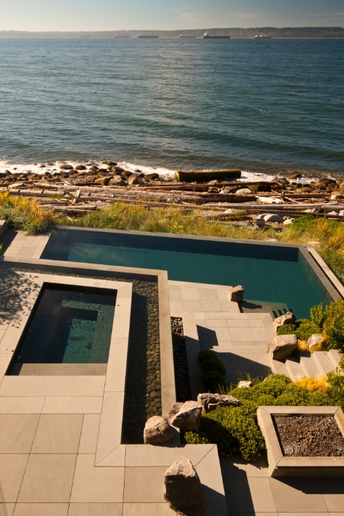For this waterfront home in West Vancouver, PSC designed a series of geometric pools surrounded by native plants descending to a revitalized shoreline. Photo: Nic Lehoux