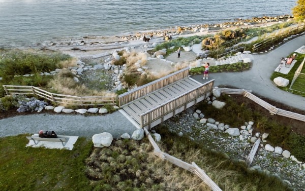 Imagine a stunningly restored waterfront public park integrating native plants, wetlands, Bigleaf Maple trees and wildflowers; bridges traverse small rocky enclaves and daylighting (bringing to the surface,) a long buried Tatlow Creek.  Paved serpentine pathways are accessible for walking and bicycles. Adjacent Tatlow and Volunteer Parks, connecting ecosystems from Point Grey to English Bay is the creation of Paul Sangha Creative. They worked with the Musqueam, Squamish and Tsleil-Waututh Nations, the City of Vancouver, the Vancouver Board of Parks and Recreation and a private-public partnership with a neighbourhood homeowner.